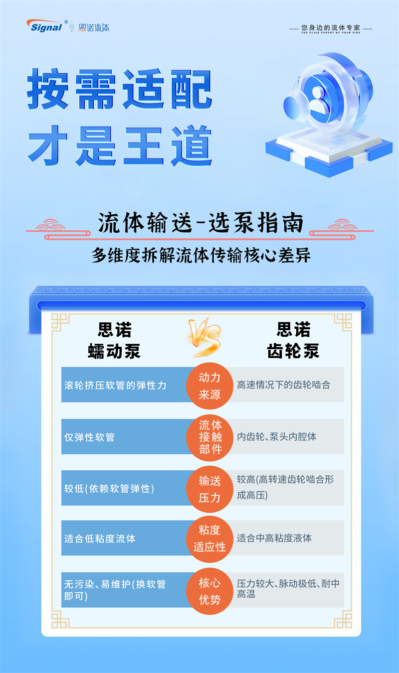 按需適配,方為選型王道。蠕動(dòng)泵和齒輪泵各有千秋。蠕動(dòng)泵輸送溫和、無(wú)污染、易清潔且能處理含固體顆粒流體,尤其適合衛(wèi)生、腐蝕性或剪切敏感介質(zhì)。齒輪泵則結(jié)構(gòu)緊湊、輸出壓力高、流量穩(wěn)定且效率高,適合高粘度流體和高壓需求。兩者并無(wú)絕對(duì)優(yōu)劣,關(guān)鍵在于根據(jù)具體應(yīng)用需求(如介質(zhì)特性、壓力、流量、衛(wèi)生等級(jí)、預(yù)算)進(jìn)行精準(zhǔn)適配。